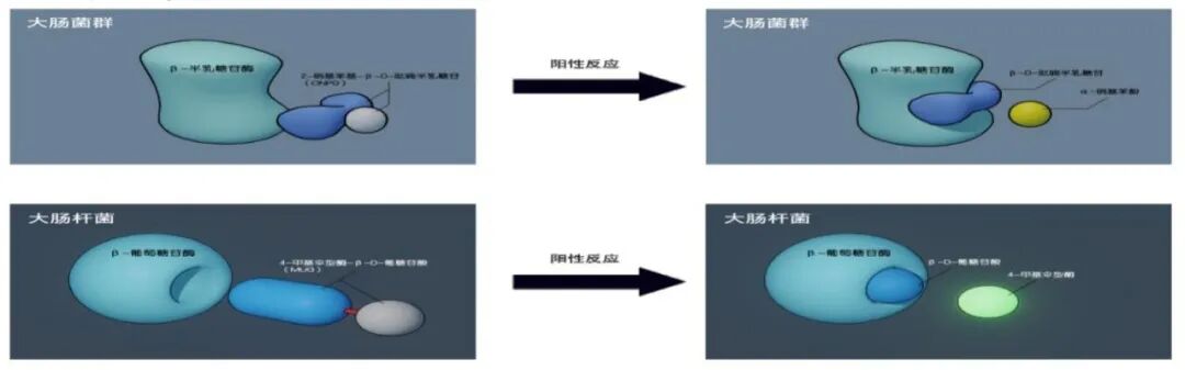 总大肠菌群、粪大肠菌群、大肠埃希氏菌能产生β-半乳糖苷酶,使培养基中的无色底物邻硝基苯β-D-吡喃半乳甘糖分解黄色的邻硝基苯酚,其中大肠埃希氏菌还能同时产生β-葡萄糖醛酸酶,使培养基中的4-甲基伞形酮-β-D-葡萄糖醛酸酶 分解为-甲基伞形酮,在紫外灯照射下产生荧光。在36±1℃经 培养后培养孔变黄的为总大肠菌群;培养孔变黄并伴有荧光的为大肠埃希氏菌;44.5℃培养后培养孔变黄的为粪大肠菌群,变黄并有荧光的为大肠埃希氏菌。统计阳性反应出现的数量,对照MPN图表,分别计算出总大肠菌群,粪大肠菌群,大肠埃希氏菌的浓度值。