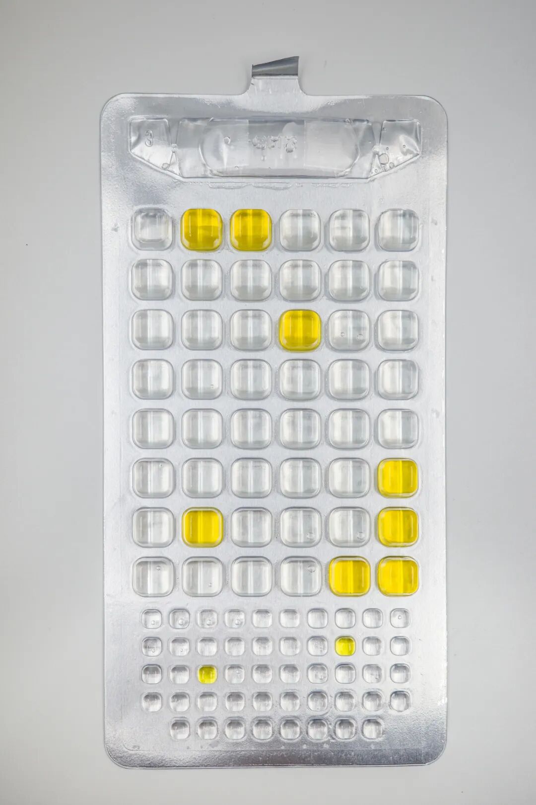 判读:黄色孔格为总大肠菌群阳性,黄色且显荧光为大肠埃希氏菌阳性,对照MPN表定量计数。